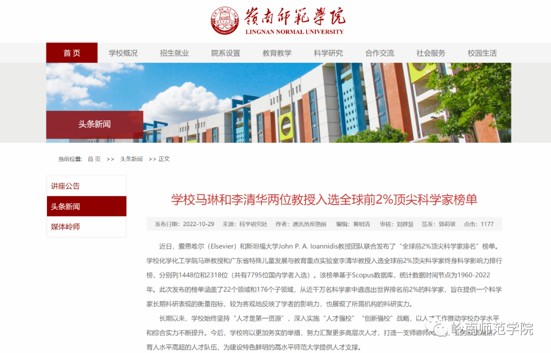 学校马琳和李清华两位教授入选全球前2%顶尖科学家榜单