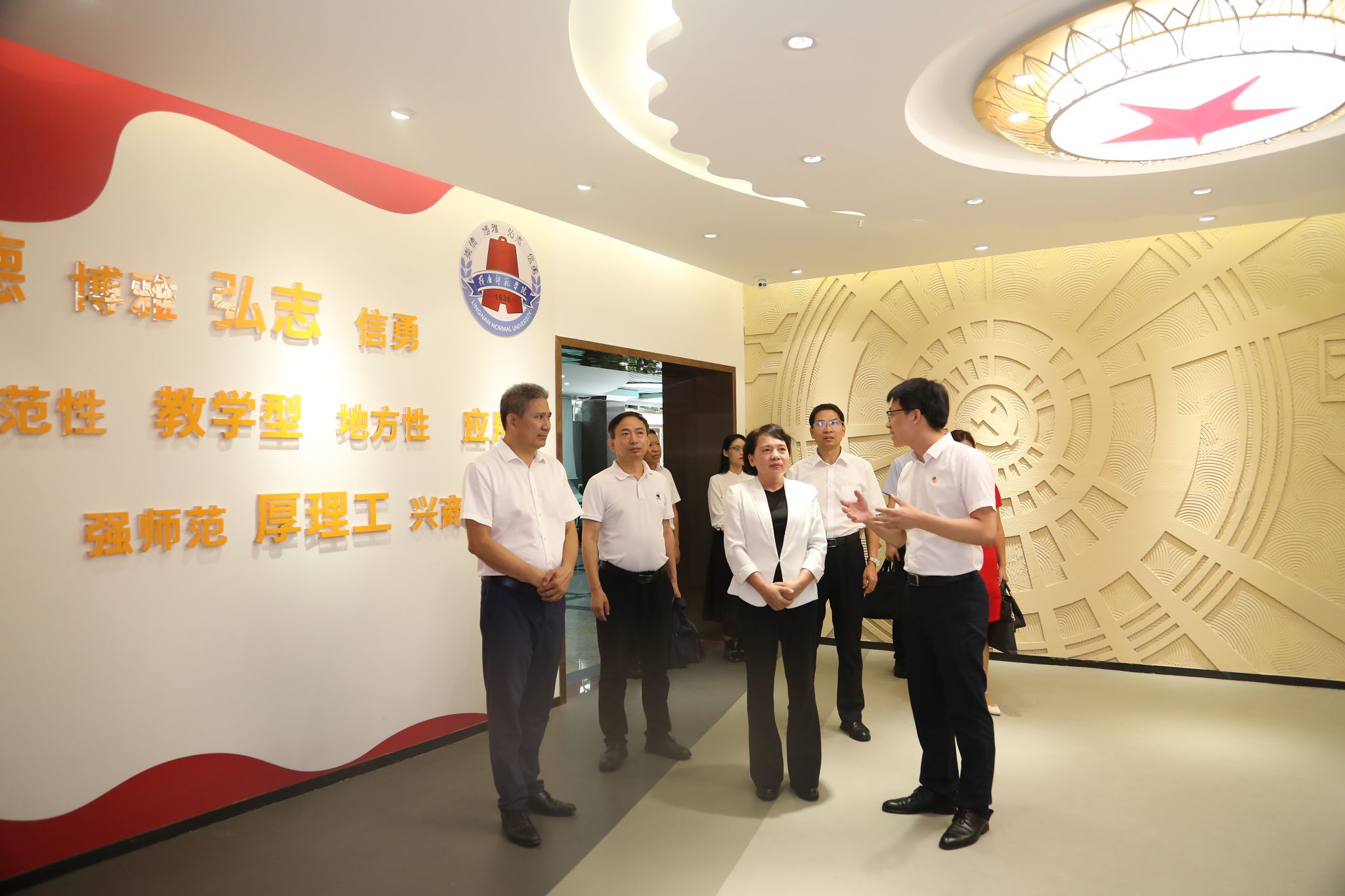 程凤英一行在林晓敏的陪同下参观了学校智慧党建文化学习教育空间、广东省特殊儿童发展与教育重点实验室、红树林生态文明展览、党群统战服务中心等地。