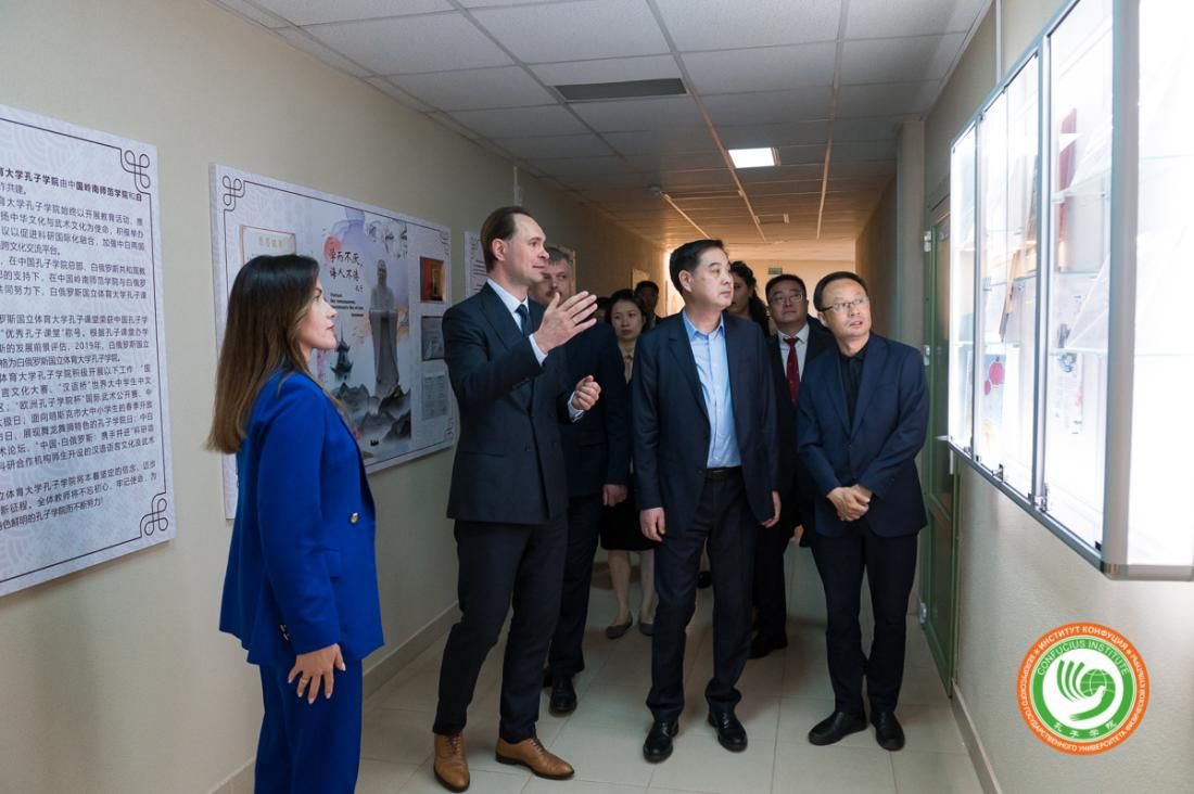 代表团一行首先考察了孔院先进的远程教学设施和现代化教学区,对孔院的教学硬件建设和育人环境给予了高度评价。随后,在古色古香的茶艺室内,2024年“汉语桥”大学生组白俄罗斯赛区冠军、全球20强选手高银栗同学为来宾献上了一场精彩的中国茶艺表演,带领来宾品鉴茶香,领略中国茶文化的深厚底蕴。