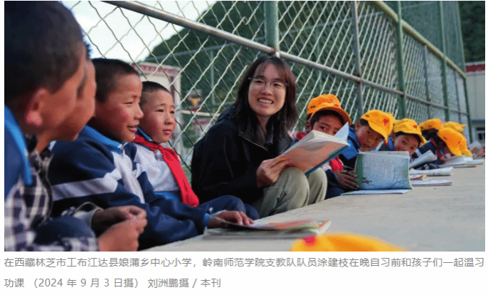 岭师新闻中心讯:在2025年西藏自治区成立60周年之际,岭南师范学院教育援藏新闻图片登上新华社主管主办新闻周刊《瞭望》重磅专栏——治国理政纪事。该图文展示的是岭南师范学院支教队队员涂建枝在西藏林芝市工布江达县娘蒲乡中心小学支教中和孩子们一起温习功课的场景。