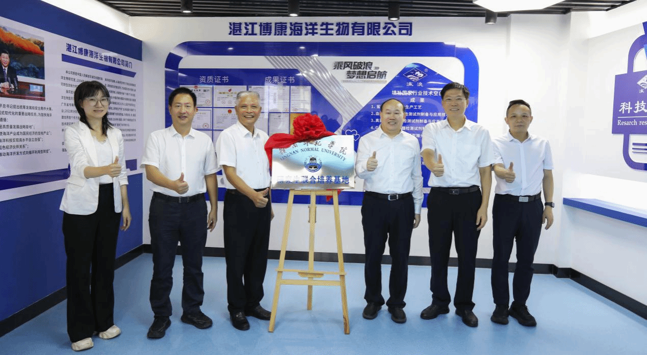 唐宇与莫水晶分别代表岭南师范学院、湛江博康海洋生物有限公司签订战略合作协议。与会领导共同为“岭南师范学院研究生联合培养基地”揭牌。学校规法处、科研处、校地合作办公室等部门负责人,生命科学与技术学院领导班子成员,博康公司管理团队等共同见证了这一重要时刻。