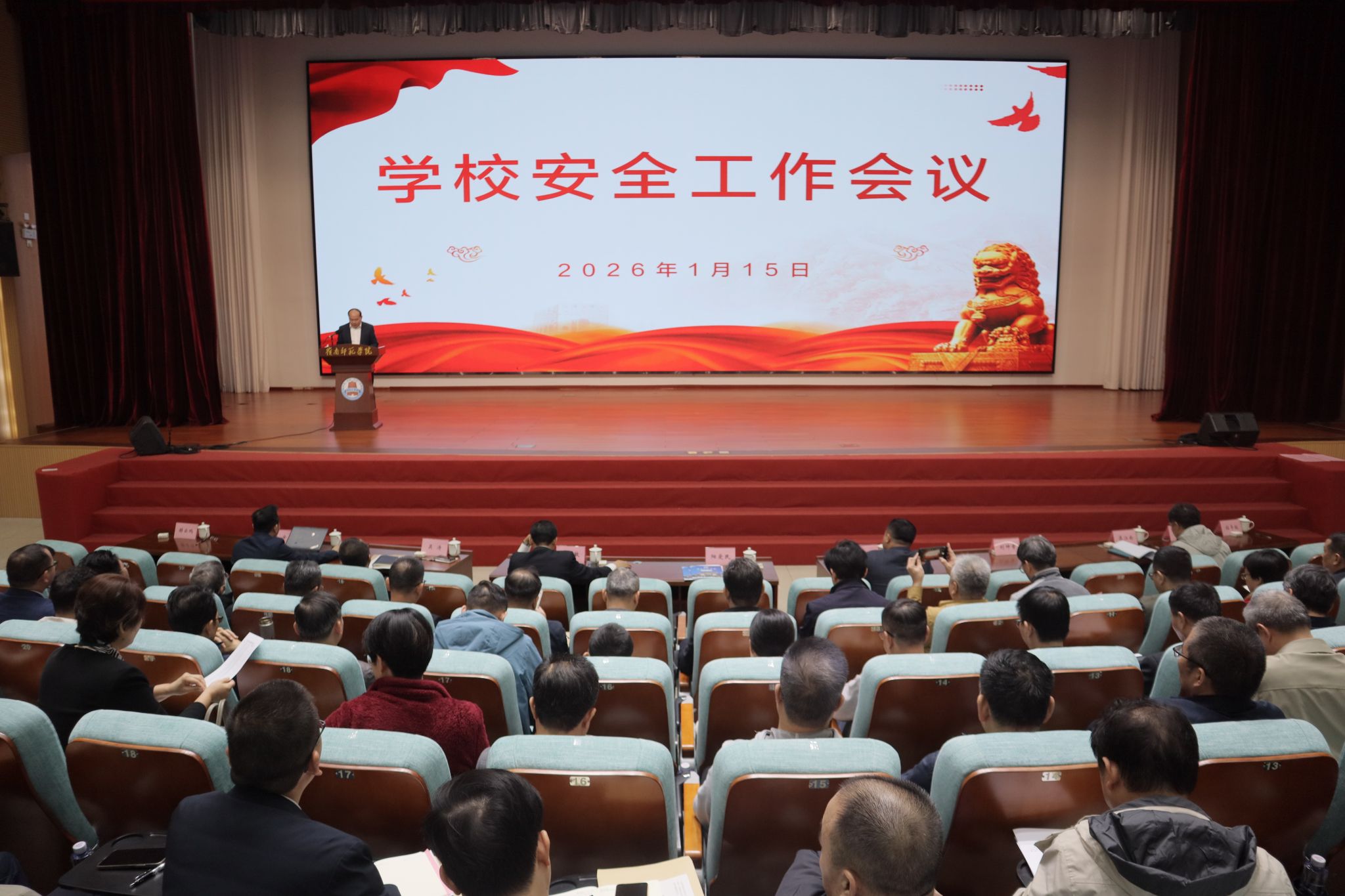 会上,副校长刘坤章全面总结了2025年学校安全工作取得的成效,客观分析了当前校园安全面临的风险和挑战,并对2026年和当前工作作出具体部署。他指出,要紧扣服务学校发展大局,统筹发展与安全,重点抓好政治安全意识形态安全、全面开展安全隐患排查整治、加强留校学生安全教育管理、做好值班值守和应急准备、健全安全工作体系机制,织牢织密学校安全稳定防线,以更高水平安全保障学校高质量发展。各单位要敢于担当、主动作为,做到守土有责、守土尽责,确保万无一失,行稳致远。