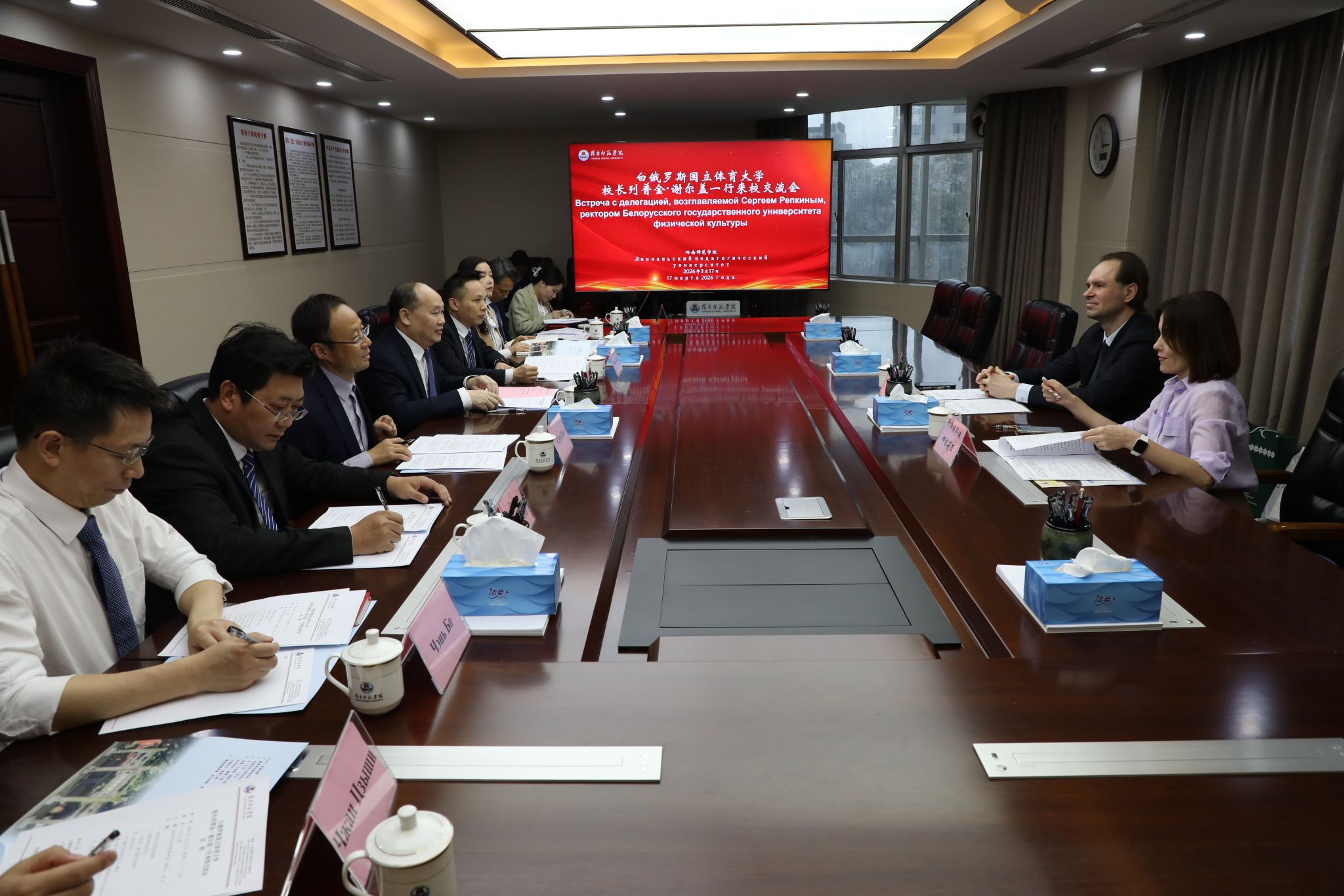 岭师新闻中心讯:3月17日下午,白俄罗斯国立体育大学校长列普金·谢尔盖、孔子学院白方院长卡斯捷耶娃·娜塔莉娅一行莅临岭南师范学院访问交流。学校党委书记阳爱民、副校长唐宇及国际交流与合作处、相关二级学院负责人热情接待了代表团,并在寸金校区一号会议室举行高规格座谈。此次访问旨在巩固两校十余年合作基础,推动中白教育合作向更高层次、更宽领域迈进。