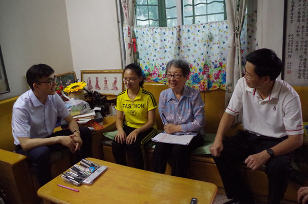 在郑光华老师家,罗海鸥一行饶有兴趣地观看了关工委“谈心亭”近期的工作成果。85岁的郑光华老师,被学生亲切称为“心灵导师”,她1990年退休后就投入到关心下一代工作中,身残志坚、矢心不改,主持关工委“谈心亭”的工作18余年,多年来还把自己的住房作为“谈心亭”的工作办公用房,每天与青年学生交流谈心,助推青年学生的成人成长,每年谈心达1400人次,曾帮助过30多位厌世轻生者振作起来。罗海鸥对她深表敬佩,高度赞赏她“退而不休、慈母情怀;学而不厌,诲人不倦”,是我们广大师生工作与学习的楷模。黄达海也和郑光华老师一同忆起以前校园内读书工作的片段,其乐融融。