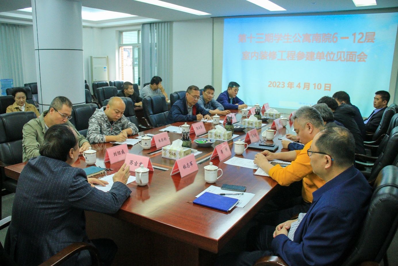 4月10日上午,苏古发副校长在二号会议室主持召开第十三期学生公寓南院6-12层室内装修工程参建单位见面会,学校学生处、安保处、基建处、后勤处、招投标中心负责人,施工单位广州市第四装修有限公司,监理单位深圳市华睿项目管理有限公司相关负责人参加了会议。