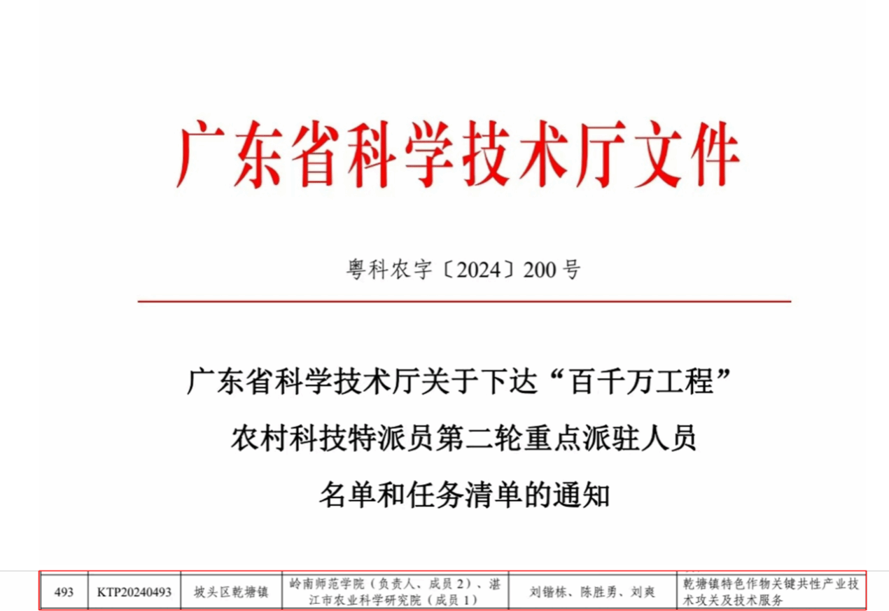 近日,广东省科学技术厅公布了“百县千镇万村高质量发展工程”第二轮农村科技特派员名单。生命科学与技术学院院长刘锴栋教授、园林系刘爽副教授、湛江市农科院陈胜勇高级农艺师组成的“乾塘镇特色作物关键共性产业技术攻关及技术服务”项目成功入选,成为该工程的重点派驻人员。