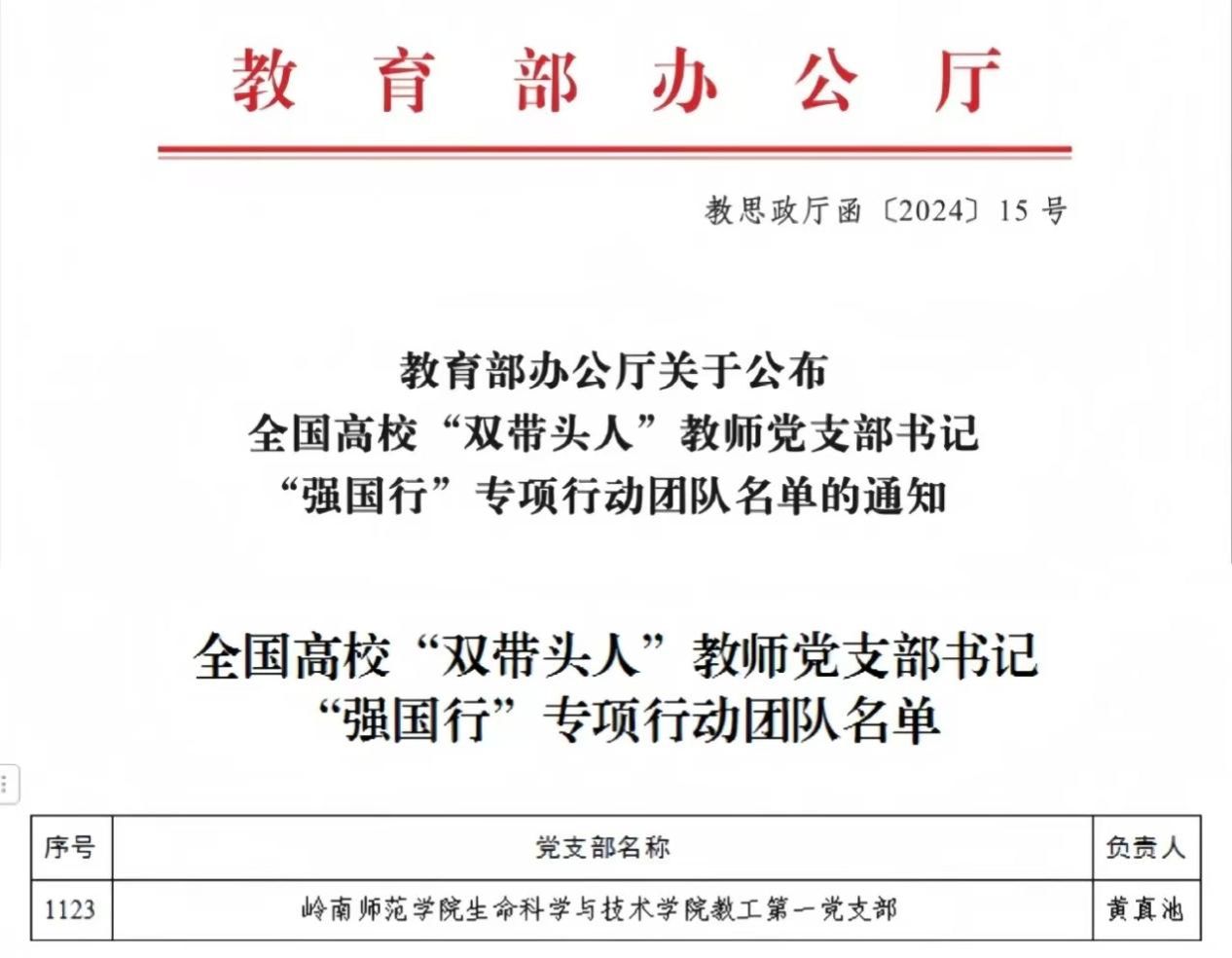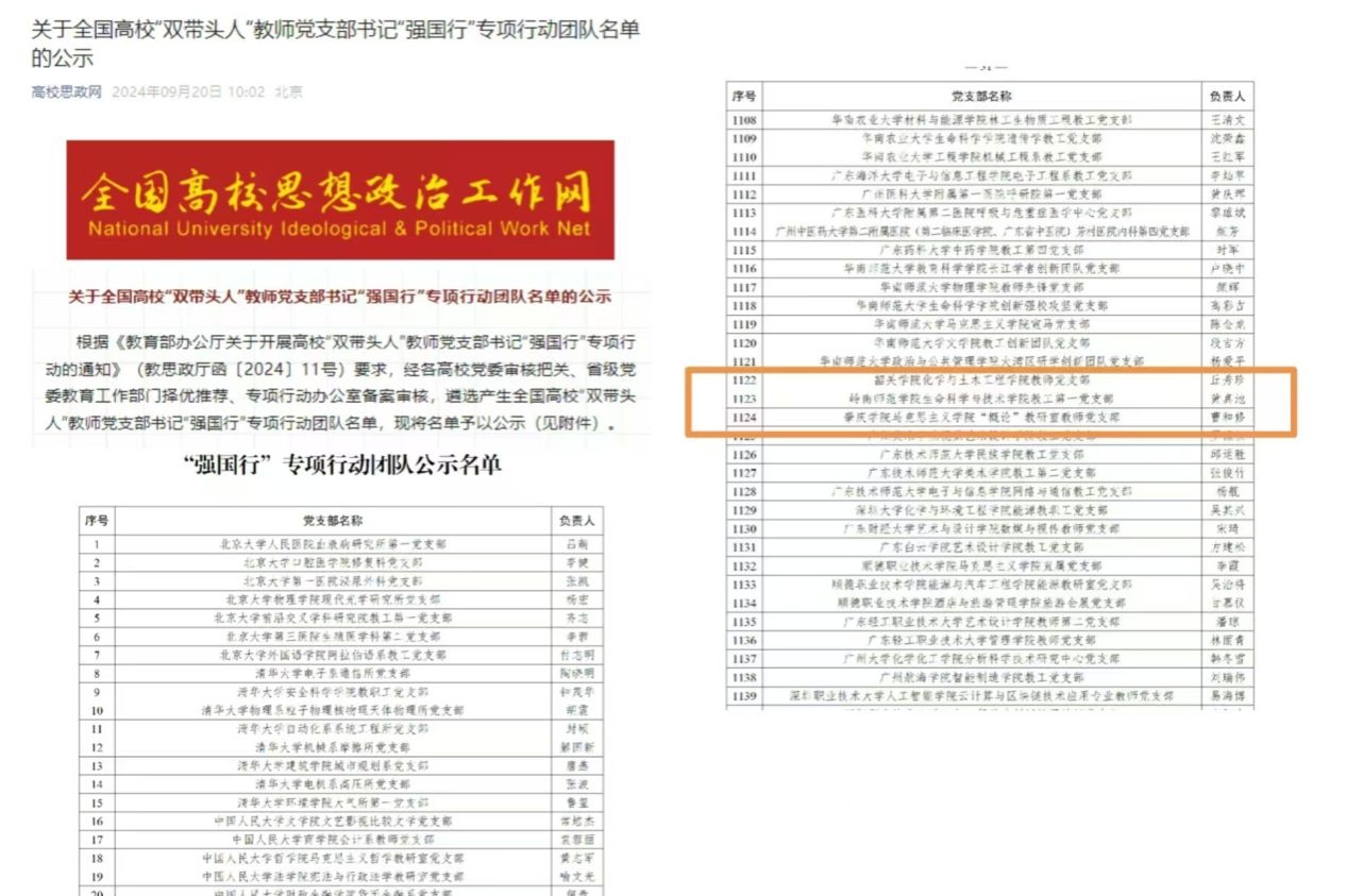 近日,教育部办公厅公布全国高校“双带头人”教师党支部书记“强国行”专项行动团队名单。岭南师范学院生科院教工第一党支部被确定为全国高校“双带头人”教师党支部书记“强国行”专项行动团队。