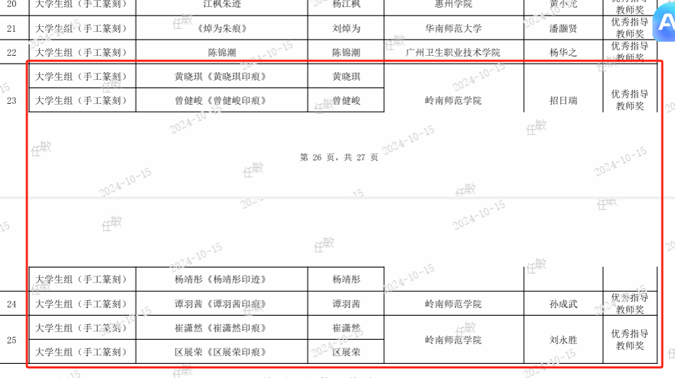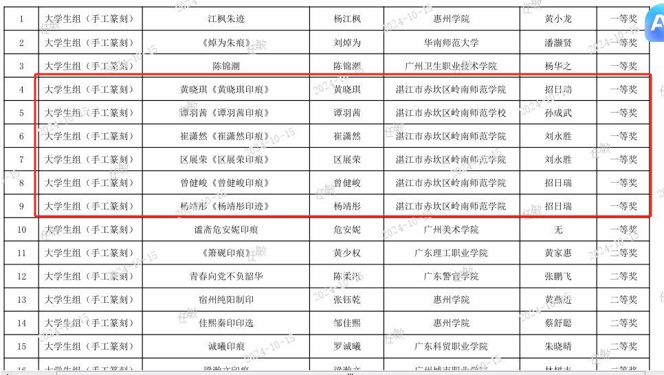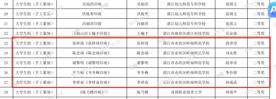 近日,广东省教育厅、广东省语言文字工作委员会公布了2024年广东省第五届中华经典诵写讲大赛获奖名单,美术与设计学院选送的12件书法、篆刻作品全部获奖,再创新高。其中获得“笔墨中国”规范汉字书写大赛一等奖1人,获得“印记中国”篆刻大赛一等奖6人,二等奖5人。同时还有3位老师获得优秀指导教师奖(刘永胜、孙成武、招日瑞)。充分体现了学院书法学专业办学水平和人才培养质量。2024年,学院书法学专业将迎来办学20周年纪念,这份获奖名单是为书法学专业办学二十周年送上的一份厚礼。