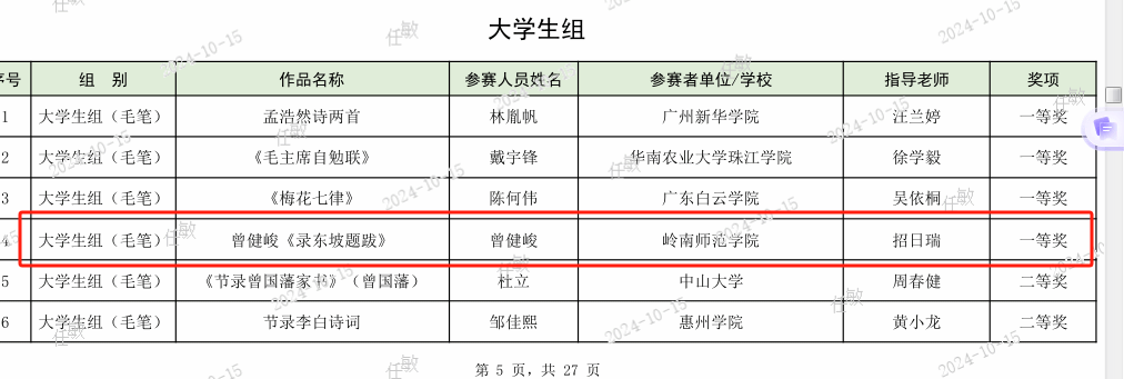 2024年第五届中华经典诵写讲大赛“笔墨中国”规范汉字书写大赛获奖名单