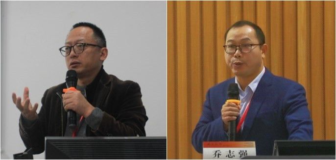 领导嘉宾讲话(左为广东省高等教育学会书法教育专委会理事长吴慧平、右为美术与设计学院院长乔志强教授)