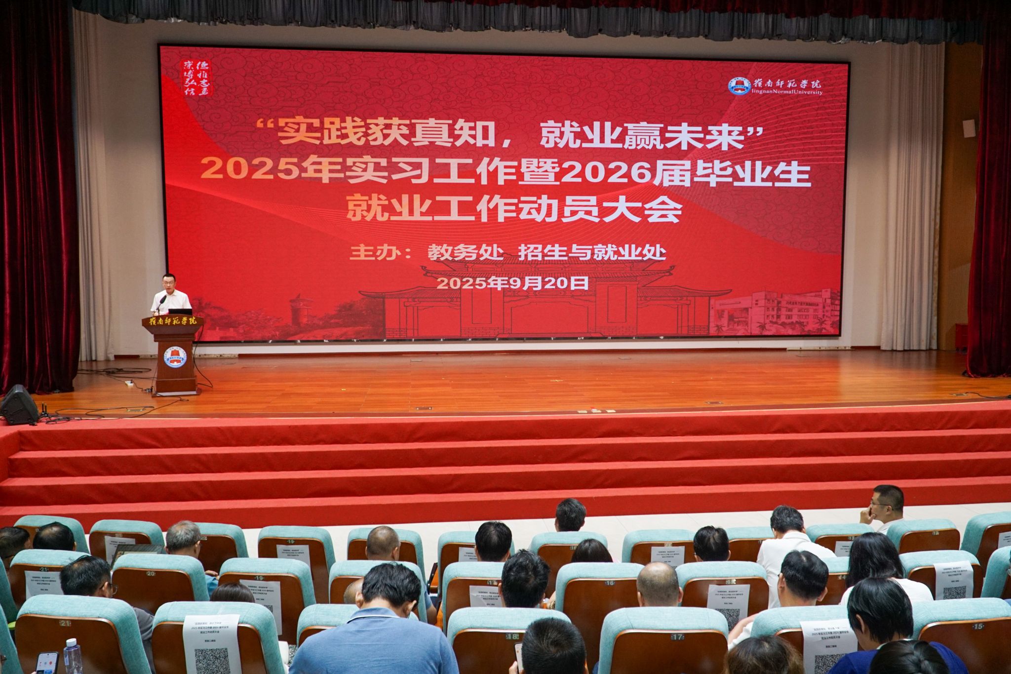 岭师新闻中心讯:9月20日晚,岭南师范学院“‘实践获真知,就业赢未来’——2025年实习工作暨2026届毕业生就业工作动员大会”在音乐厅召开。会议围绕实习工作与就业准备一体化推进,多部门从政策指导、能力提升、安全管理等维度展开部署,共同为开启实习征程的学子“导航定向”。副校长金义富出席会议并作总结讲话,教务处处长周立群主持会议。