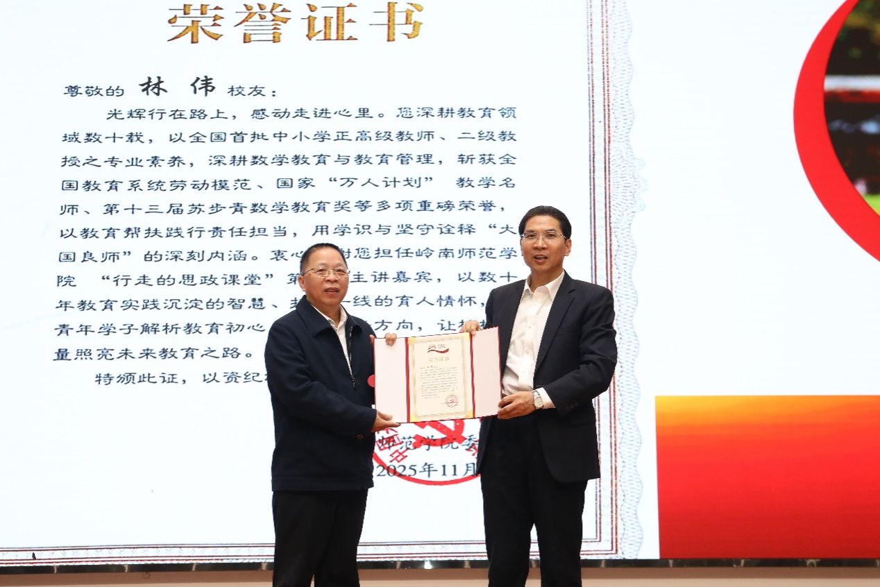 11月24日上午,数学与统计学院于音乐厅开展第55-56期“行走的思政课堂”报告会。学校党委副书记林晓敏出席会议并为报告会主讲嘉宾颁发荣誉证书。1992届财会专业校友、龙之珍珠&AKOYA品牌创始人蔡文江,1990届数学专业校友、深圳市第二高级中学副校长林伟受邀担任主讲嘉宾。校友办校友联络科科长郭曌汾,学院党政班子成员及2023级全体同学参加报告会,报告会由学院党委书记叶建仔主持。