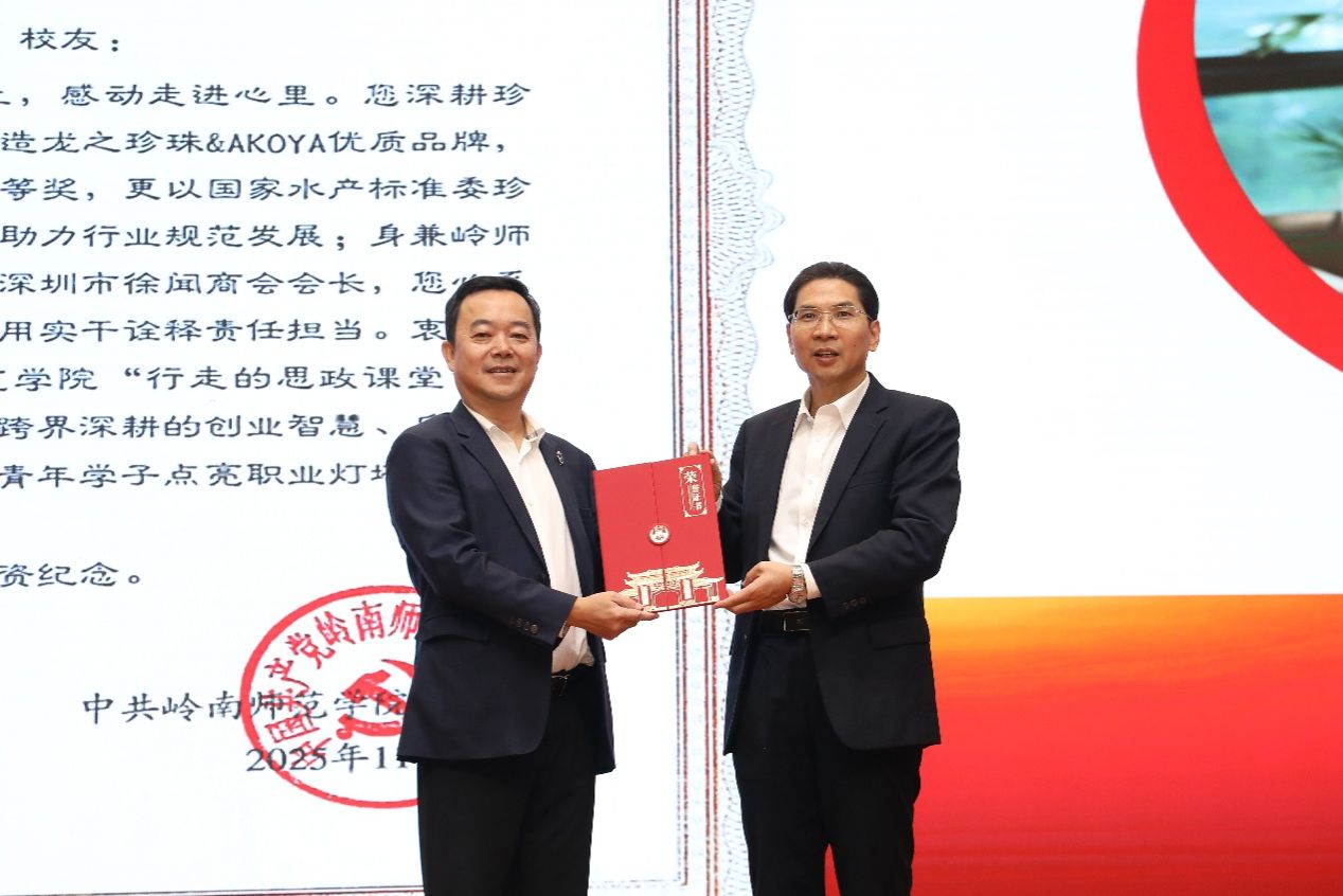 报告会上,蔡文江校友以“心中有光,镜水和鸣”为题,讲述了自身从校园学习到行业深耕的奋斗历程。他回顾了母校学习时光里两次备考的成长收获,分享了深耕珍珠行业近30年,从拿下国际订单到创立知名品牌、牵头制定行业标准的创业故事,更提及坚守祖母传承的诚信理念,以责任担当践行初心,同时倡导终身学习,主动拥抱新事物。他用自身经历传递了坚守本心、勇于担当、深耕不辍的人生态度。