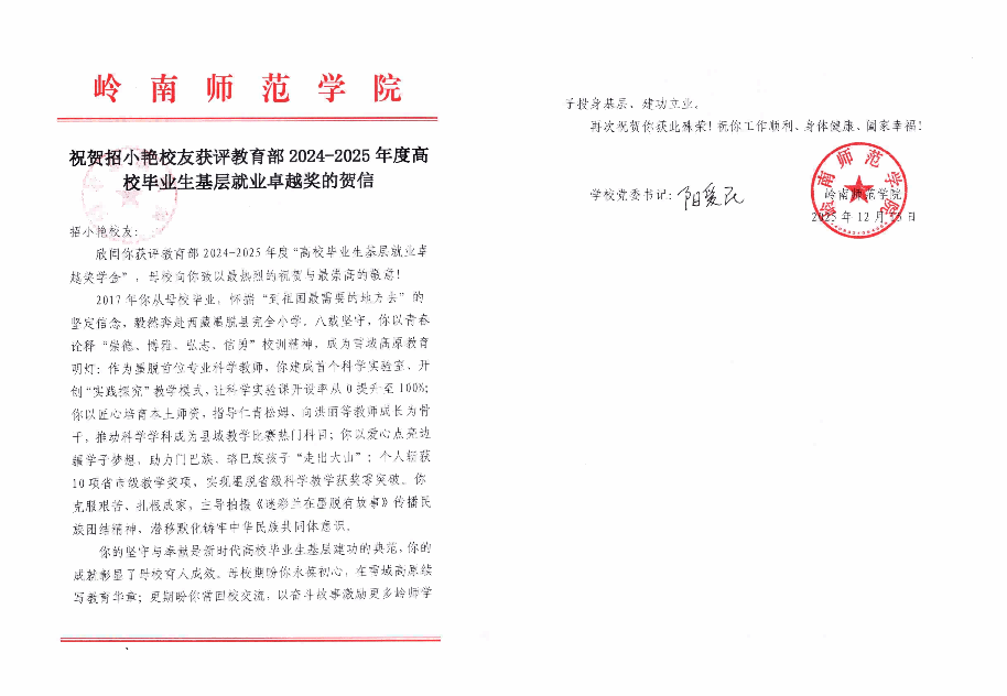 近日,教育部高校学生司公布2024—2025年度“高校毕业生基层就业卓越奖学(教)金”获奖名单,我校2017届本科毕业生招小艳荣获该奖项。作为全国418名(广东省仅16名)获此殊荣的优秀高校毕业生之一,她以八年雪域坚守诠释初心,用教育奉献书写担当,不仅成为岭师“崇德、博雅、弘志、信勇” 校训精神的生动践行者,也凸显了学校“援藏良驹”深耕基层就业育人的显著成效。