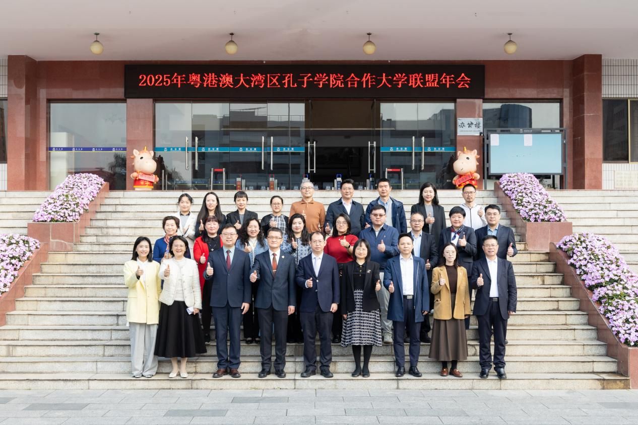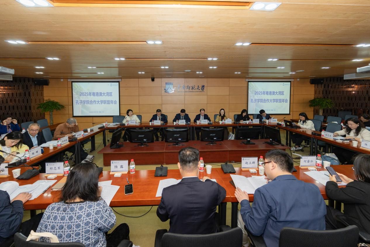 1月17日, 2025年粤港澳大湾区孔子学院合作大学联盟年会隆重召开。本次会议以“数智赋能孔子学院建设”为主题,围绕数字化转型背景下孔子学院的发展机制与创新路径展开深入研讨。来自中国国际中文教育基金会、广东省教育厅等单位的代表,学校党委常委、副校长唐宇、国际交流与合作处处长郑志军,以及近30名来自10所联盟成员高校的孔子学院负责人和嘉宾齐聚一堂,共商发展。