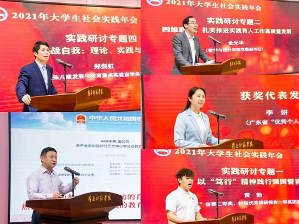 在交流分享环节,广东省特殊教育儿童发展与教育重点实验室常务副主任郑剑虹希望同学们要勇于挑战自我,将理论研究与社会实践有机结合;教务处副处长夏加亮从五育并举的高度阐释了劳动教育与社会实践的融合途径;数学与统计学院党委副书记全光华提出要四维联动,扎实推进实践育人工作高质量发展;省级“优秀个人”李妍分享了指导学生参与社会实践的心得体会;“挑战杯”省赛二等奖、校级优秀调研报告一等奖学生代表黄勃表示要以“笃行”精神,积极投身社会实践,践行强国誓言。