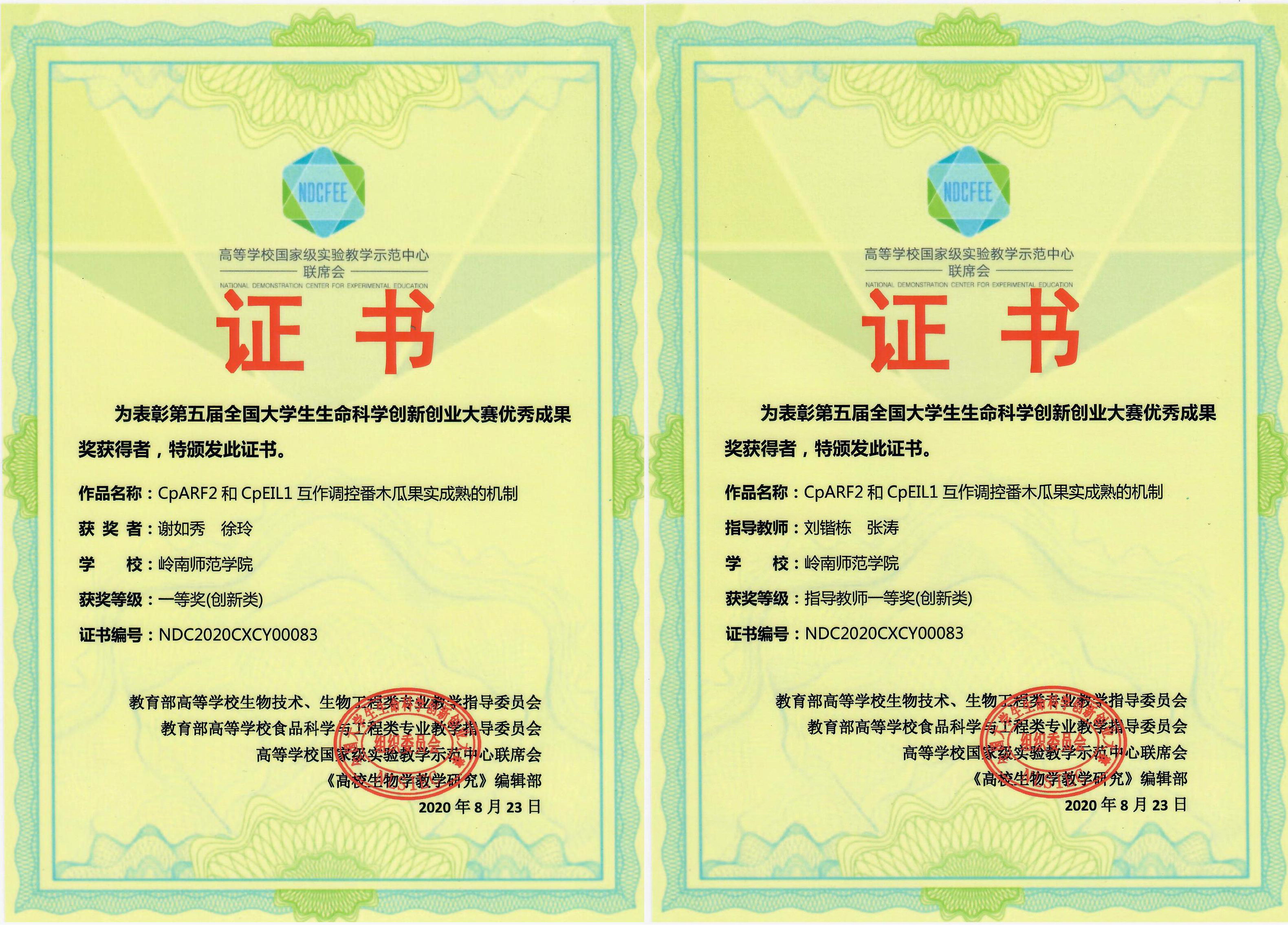 本届大赛生科院共选派了五项创新类作品参加竞赛。谢如秀、徐玲同学的《cparf2和cpeil1互作调控番木瓜果实成熟的机制》(指导老师:刘锴栋、张涛)参赛作品脱颖而出,入围公开决赛答辩并获得一等奖,该成果稍早前在国际知名植物学刊物《plant journal》发表;邓嘉欣、霍靖欣等同学的《谷胱甘肽化修饰对盐胁迫下番茄幼苗抗氧化系统的影响》(指导老师:周艳)获得三等奖。