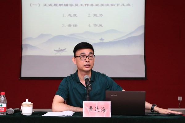 黄达海指出选择辅导员岗位就是选择了一种独特的青春、一场全方位的历练、一份立德树人的责任和一次有意义的传承。他要求各辅导员要从工作作用的角度全面认识辅导员的“辅”,从工作方法的角度深刻认识辅导员的“导”,从岗位身份的角度清晰认识辅导员的“员”,把握态度、能力、责任和作风四个履职关键,按照所处层级的功能定位努力实现自我价值。他强调辅导员要立足习近平总书记在学校思想政治理论课教师座谈会上对思政教师提出的政治要强、情怀要深、思维要新、视野要广、自律要严、人格要正“六要标准”,着力提升自身的核心素养,为培养社会主义合格建设者和可靠接班人而努力奋斗。
