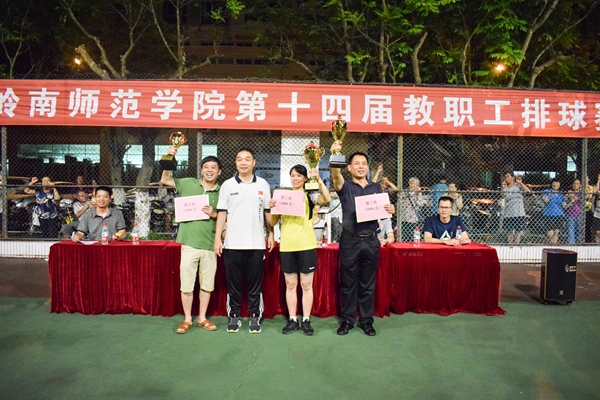 岭师新闻中心讯:“加油!”“好球!” 6月14日晚上,学校第十四届教职工排球赛决赛在燕玲区排球场举行。物理科学与技术学院与机关二队进行普通组冠军争夺赛,经过角逐,物理科学与技术学院取得冠军。学校党委副书记、工会主席王恒胤到现场观看比赛、为运动员加油,并为冠军队伍颁奖。