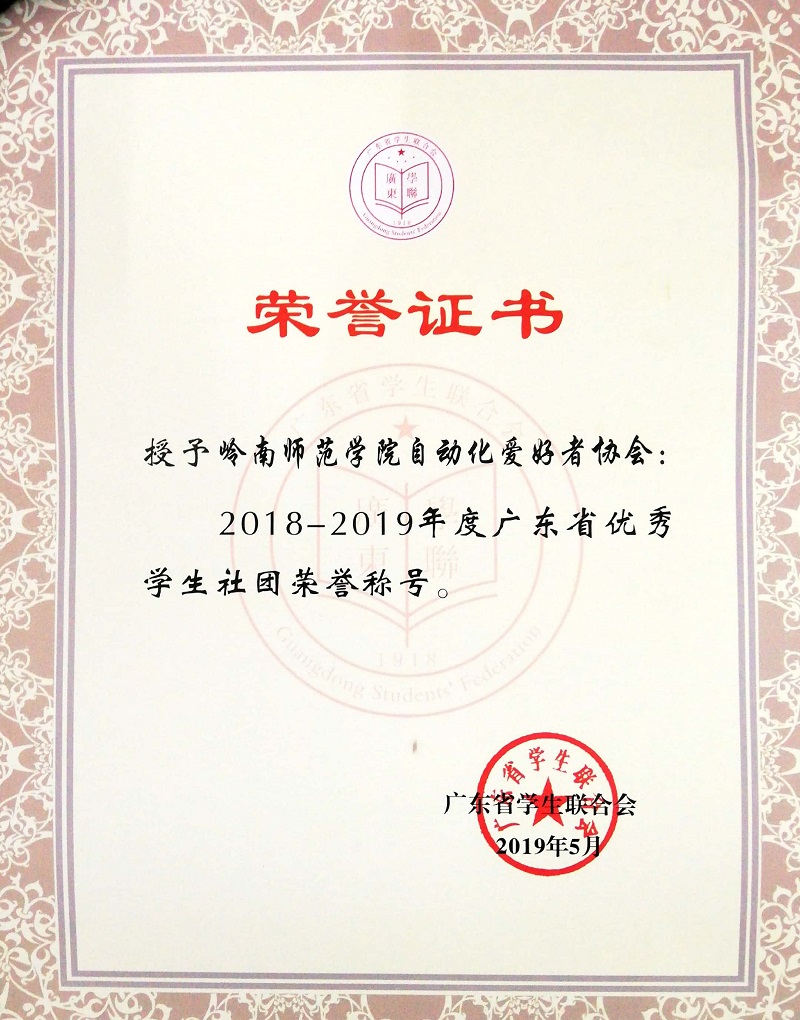 今年4月,广东省学生联合会在全省高校开展2018-2019年度广东省优秀学生会、优秀学生社团、优秀学生干部的评选活动,我校根据要求,积极组织申报工作,经过个人申报、学院推荐、校团委组织集体评审等环节,推荐机电工程学院自动化爱好者协会参加全省的评选,最终顺利获选为“广东省优秀社团”,这是该社团继获得湛江市2018—2019年优秀社团之后的又一殊荣。