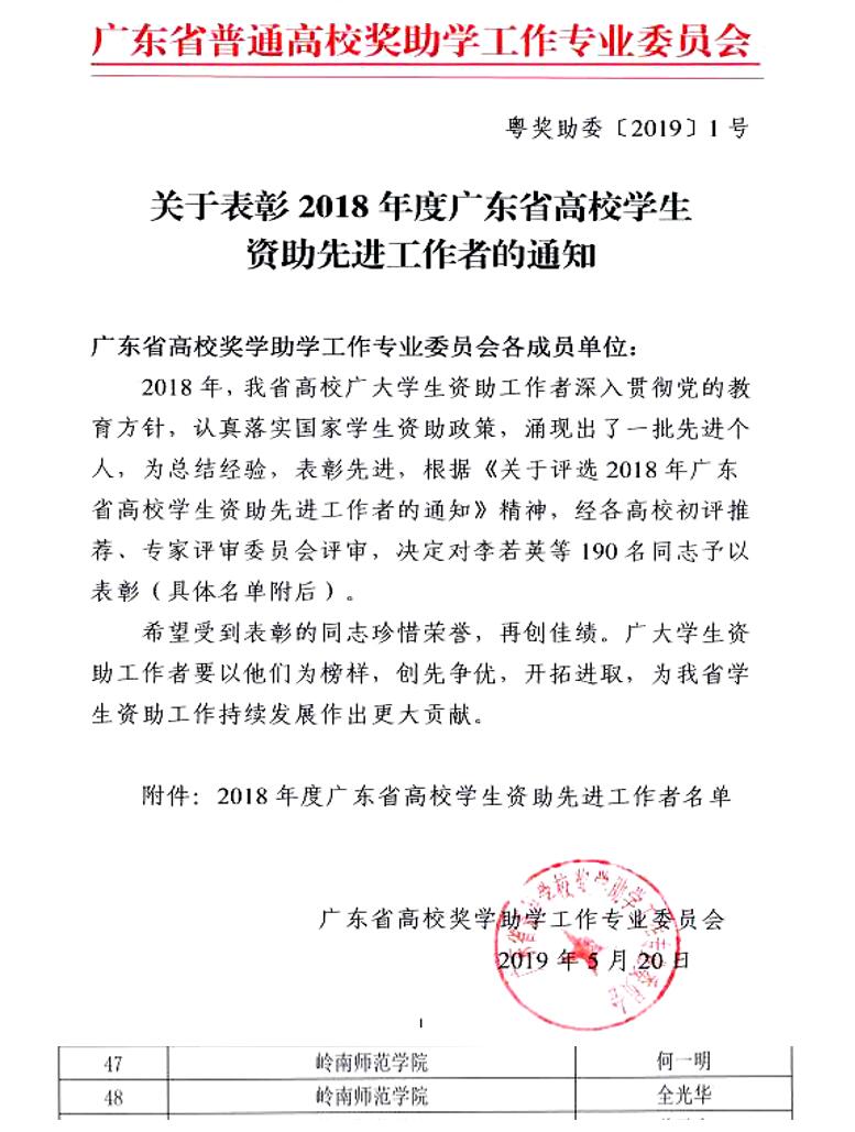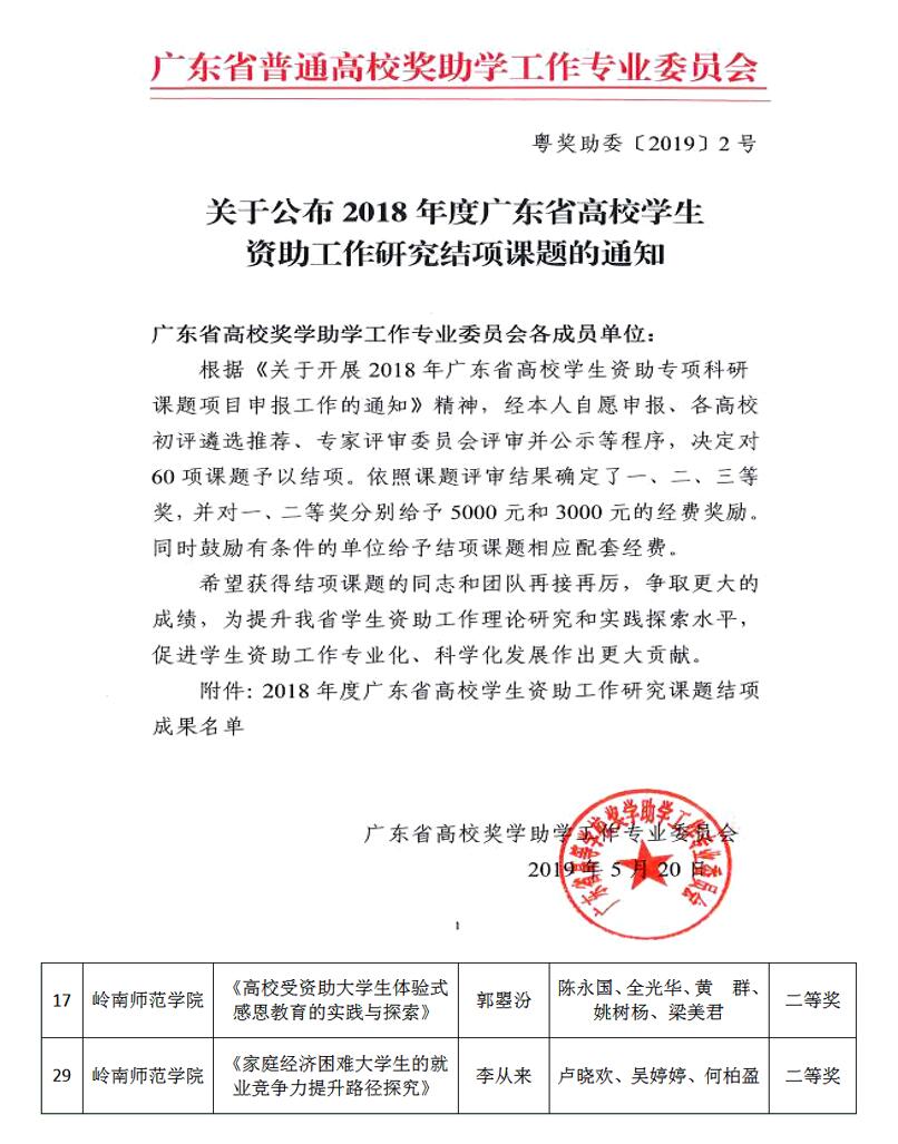 近日,广东省高校奖学助学工作专业委员会公布了2018年广东省高校学生资助先进工作者的表彰决定和2018年度广东省高校学生资助工作研究课题结项成果名单,我校全光华和何一明两名老师获评“2018年广东省高校学生资助先进工作者”,郭曌汾老师主持的项目《高校受资助大学生体验式感恩教育的实践与探索》和李从来老师主持的项目《家庭经济困难大学生的就业竞争力提升路径探究》均获“2018年广东省高校学生资助工作研究课题”结项成果二等奖。