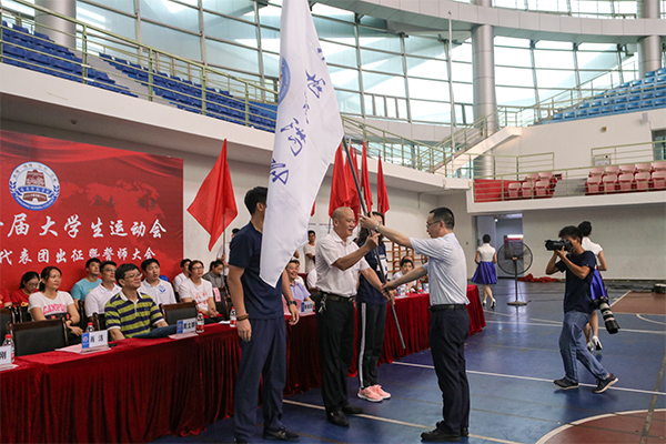 岭师新闻中心讯:4月29日下午,广东省第十届大学生运动会岭南师范学院代表团出征暨誓师大会在体育馆举行。学校副校长、学校体育工作委员会主任金义富向代表团授旗,为教练员颁发聘书,对全体学生运动员发出参赛动员令。