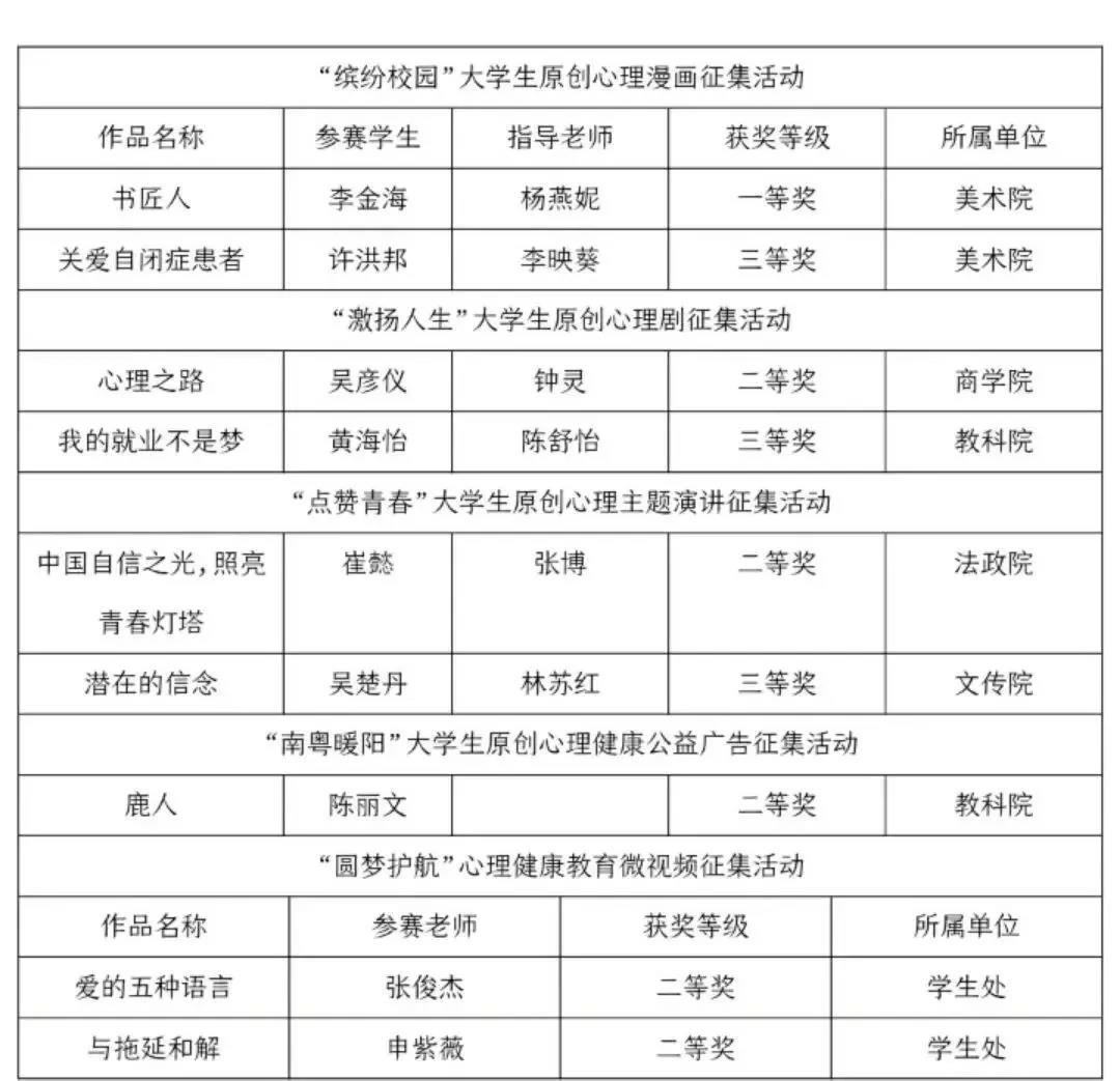 党委学生工作部对标新任务、新要求,发出开展学工队伍“大学习、大讨论”活动的通知,率先组织学工干部深入学习贯彻岭南师范学院第一次党代会、2019年度会议和2019年度学生工作会议精神,精心谋划推进实施“对标行动”计划和品牌创建工作方案,以新举措推动“新学工”上新水平,取得了良好的开局。开学之初,在广东省教育厅公布的高校心理健康教育系列活动中,我校共有9项成果获奖,其中一等奖1项、二等奖5项、三等奖3项,获奖数量在全省高校排名第三。