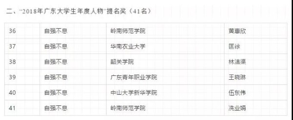 “2018年广东大学生年度人物”提名奖