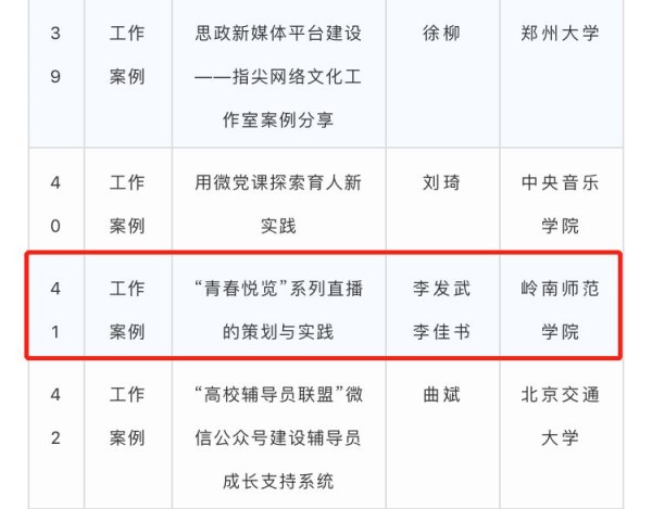 近日,由教育部思想政治工作司、中央网信办网络社会工作局主办的第三届“全国高校网络教育优秀作品推选展示活动”遴选结果公布,我校《“青春悦览”系列直播的策划与实践》荣获工作案例三等奖。这是“青春悦览”——岭师青年好故事微网剧项目(以下简称“青春悦览”)在获得湛江市宣传思想文化工作创新案例三等奖之后的又一重要喜讯。本次活动中工作案例类项目共收到全国万余份作品,经过省级初评、全国展示,最终全国共有95份作品获奖,其中一等奖有10份,二等奖有19份,三等奖有28份,优秀奖有38份,我校是广东省唯一一所获得工作案例三等奖以上的高校,也是我校在此项活动中目前所获得的最高荣誉。