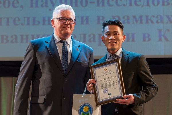 图为白俄罗斯教育部部长伊戈尔·瓦西里列维奇·卡尔边科先生为获奖留学生颁奖。