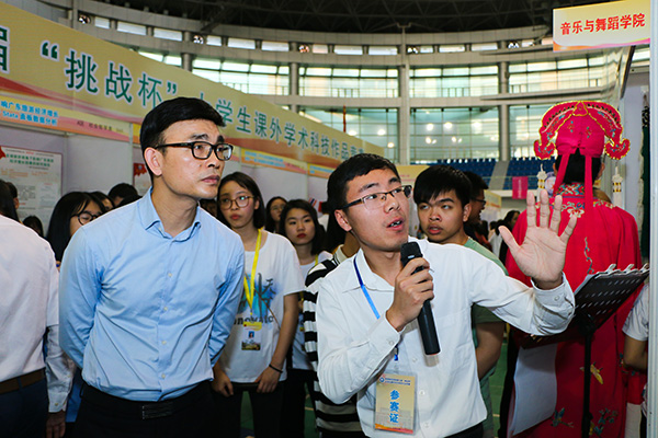 黄达海一行到展位前参观大学生竞赛作品,就作品的创新点、竞争优势及可操作性等环节对学生进行了询问,并鼓励学生要将科技创新与社会实践有效对接,把目光放长远,走向更大的舞台。