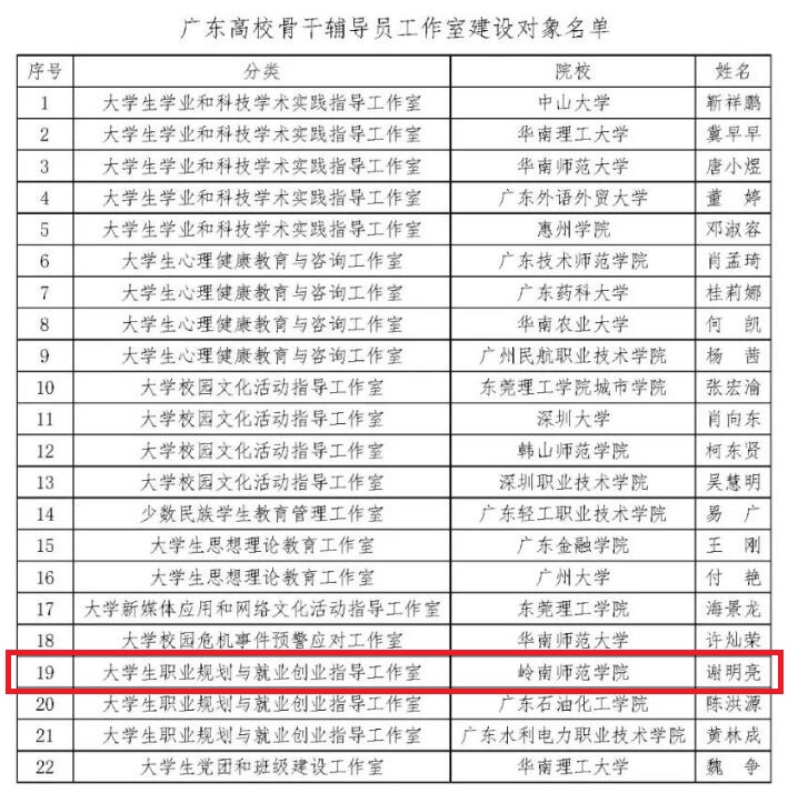 近日,教育部高校辅导员培训和研修基地(华南师范大学)公布广东高校骨干辅导员工作室遴选结果,我校文学与传媒学院辅导员谢明亮主持的“大学生职业规划与就业创业指导工作室”成功入选建设对象名单,实现了我校省级辅导员工作室零的突破,展现了我校“新学工”建设带来的队伍建设新风貌。