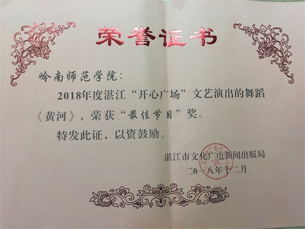 岭师新闻中心讯: 1月3日晚,由湛江市文化广电旅游体育局主办的2018湛江“开心广场”群众文化活动总结大会在湛江影剧院举行。会议对2018年度湛江“开心广场”文艺演出“最佳节目”和“优秀节目”进行了表彰。我校舞蹈表演《黄河》荣获2018年度湛江“开心广场”文艺演出“最佳节目”奖。古筝《春到拉萨》、二重唱《相信自己》,荣获2018年度湛江“开心广场”(赤坎)文艺演出“优秀节目”奖。