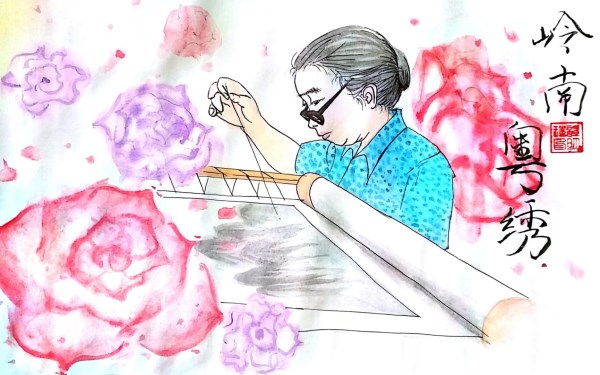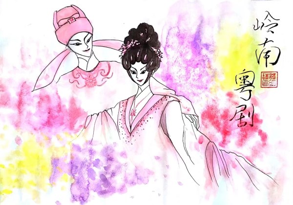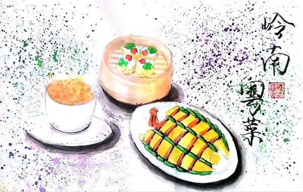 《岭南·粤韵》选取了岭南文化中具代表性的粤剧、粤菜、粤绣绘以为水彩画,构图简洁,铺以清新亮丽的色彩,展示出岭南风韵,引起了大家对岭南特色文化的珍视。《网络时代秀出传统美》描绘了直播中的青年舞狮表演,舞狮为我国优秀传统文化,舞狮表演者为青年,直播为当下最火热的时代特色,全画彰显了网络拉进青年与优秀民族文化的距离的主题。