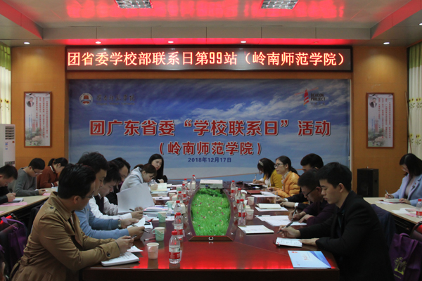 12月17日下午,共青团广东省委学校部部长廖庆春在团湛江市委王敦滟副书记的陪同下莅临我校开展“学校联系日”活动(第99站),重点了解共青团改革工作与成效。校党委黄达海副书记接见并带领廖庆春一行参观校园景观和团学阵地,参加调研座谈会。