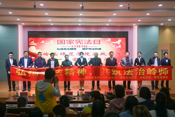 仪式上,法政学院法学系主任孟庆吉老师领读誓词,集体进行宪法宣誓,铭记共筑法治中国、法治岭师的使命担当。法政学院学子通过丰富的文艺节目,弘扬宪法精神。诗歌朗诵《“粤岭之光,宪法之光”》彰显了岭师学子的法律担当;宪法知识普及情景剧展示了宪法保证我们受教育的权利,保障我们平等就业、老有所依的权利;手语舞表演《“宪法伴我成长”》寓意无声的宪法伴我们同行,为我们护航;微视频展播《我与宪法”》让大家进一步了解宪法及“七五普法”,坚定尊崇宪法、维护宪法、遵守宪法之心。