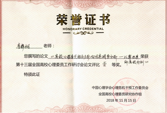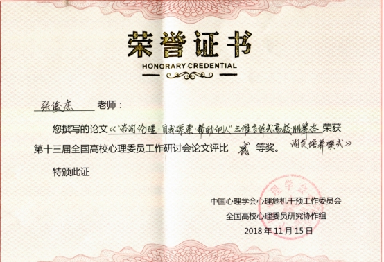 在本次大会上,我校在来自全国的54所申请理事单位的高校中脱颖而出,顺利成为全国高校心理委员研究协作组理事单位(共批准新增20所)。此外,我校心理健康教育与咨询中心李静娴老师撰写的论文《高校心理委员胜任力影响因素调查分析——以粤西某所高校为例》在来自全国各高校88篇论文中脱颖而出,获评第十三届全国高校心理委员暨朋辈心理辅导研讨会优秀论文一等奖(共9篇)、张俊杰老师撰写的《“咨询伦理·自我探索·帮助他人”三维立体式高校朋辈咨询员培养模式》获评优秀论文二等奖。