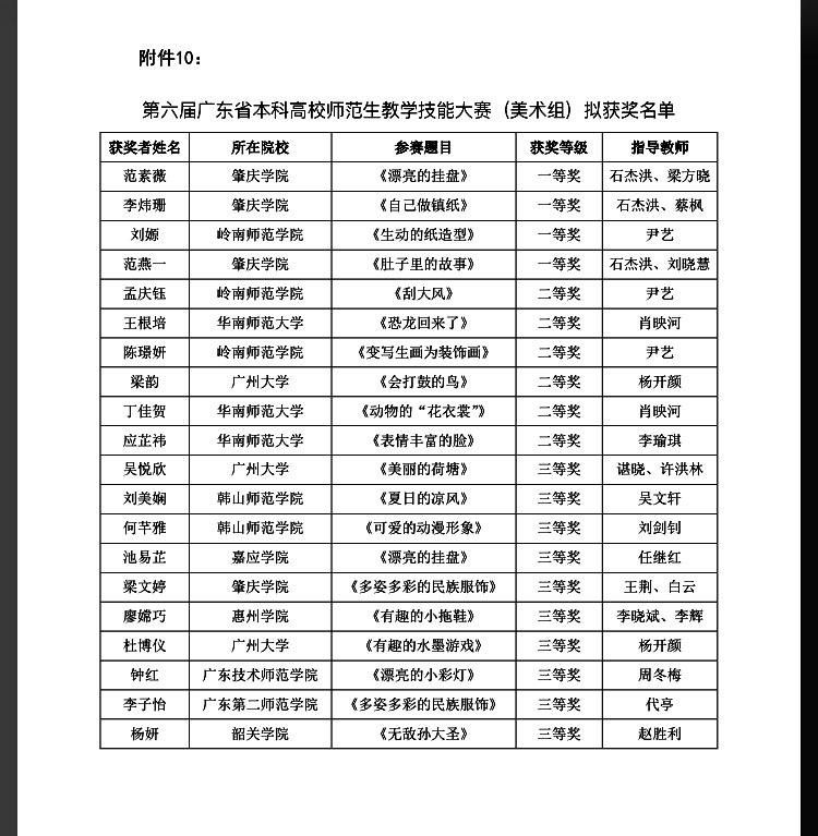 从近日公布的第六届广东省本科高校师范生教学技能大赛(美术组)获奖名单获悉,美术与设计学院进入复赛的三位同学成绩优异。其中刘嫄同学获一等奖,孟庆钰和陈璟妍两位同学均获二等奖,尹艺老师获“优秀指导教师”称号。