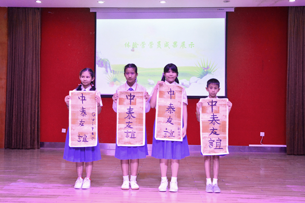 在活动现场,大家一起观看了13天交流学习的精彩回顾视频。泰国中小学生们诚挚地向我校任课教师献上礼物以谢师恩,并分别展示了他们的书法作品、美术作品和剪纸、脸谱以及中国结手工艺作品等学习成果。