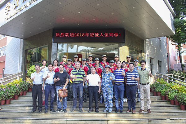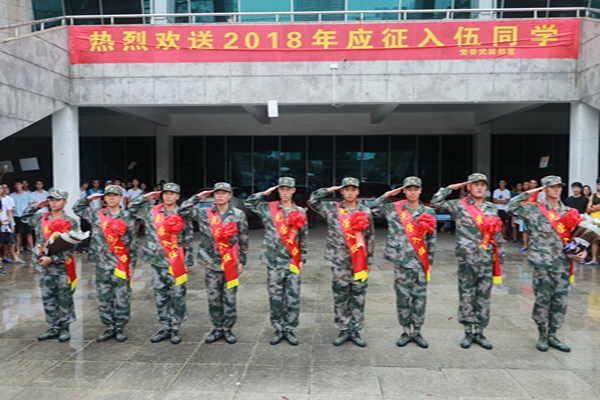 今年我校共有13名学生经过层层选拔光荣入伍,他们分别是:来自体育与科学学院的胡锐生、吴国庄、蔡富杰、戚境豪、高飞、陈华帅、欧阳东明、庄学珑,信息工程学院的曾锐,美术与设计学院的贾靖、张子云,化学化工学院的曾益方,基础教育学院的李宗懋。