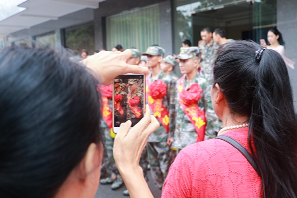 出征仪式上,入伍学生身着军装,头戴军帽,胸前披着授带和大红花,进行了离校前的最后一次列队——向左看齐、向前看、稍息、敬礼,动作整齐划一,前来欢送的亲友团频频举起手机拍下帅气的一幕。临行前,一位母亲紧紧拥抱着将要上车的儿子,眼中满含泪水,口中喃喃低语,诉说着对儿子的嘱咐。师长、舍友们也纷纷与参军学生互道珍重,并一直挥手目送着车辆离去。