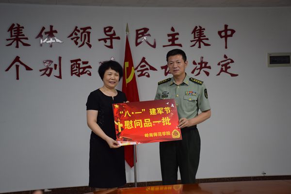 兰艳泽表示湛江是驻军大市,军人是保卫湛江安全的卫士,感谢军分区对岭师国防教育、征兵、军训以及保护岭师一方水土做出的贡献,军分区是岭师的坚强后盾。同时她表示,期待能加强军校合作,友谊长存,永远一家亲。冯振鹏等领导班子热情接见了慰问团一行,对慰问活动表示感谢。作为友好邻居,湛江军分区见证着岭师的发展,赞扬岭师取得的成就。他向慰问团介绍了近期部队改革、官兵教育、战备训练、民兵整组、国防动员、征兵工作等方面的基本情况。