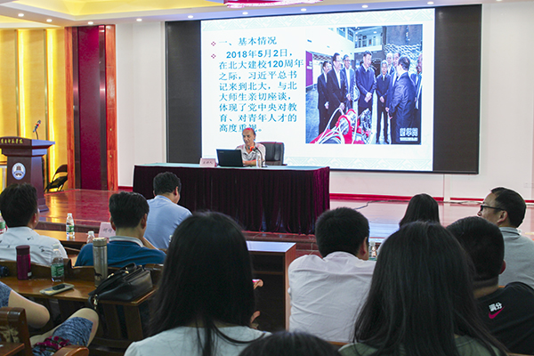 何增光用丰富的图文解读了习近平总书记在北大师生座谈会上的重要讲话。他指出,习近平总书记的重要讲话明确了培养德智体美劳全面发展的社会主义建设者和接班人的这一个根本任务;明确了高校工作要把立德树人作为检验学校一切工作的根本标准、把师德师风作为教师评价的第一标准的这两个标准;提出了要抓好坚持办学正确政治方向,建设高素质教师队伍,形成高水平人才培养体系这三项基础性工作;对广大青年提出践行爱国、励志、求真、力行,既要做追梦者,更要做圆梦人这四点希望。何增光与师生们分享了学习习近平总书记重要讲话精神的感悟,鼓励青年学生向有理想、有梦想、有本领、有担当的方向奋斗。