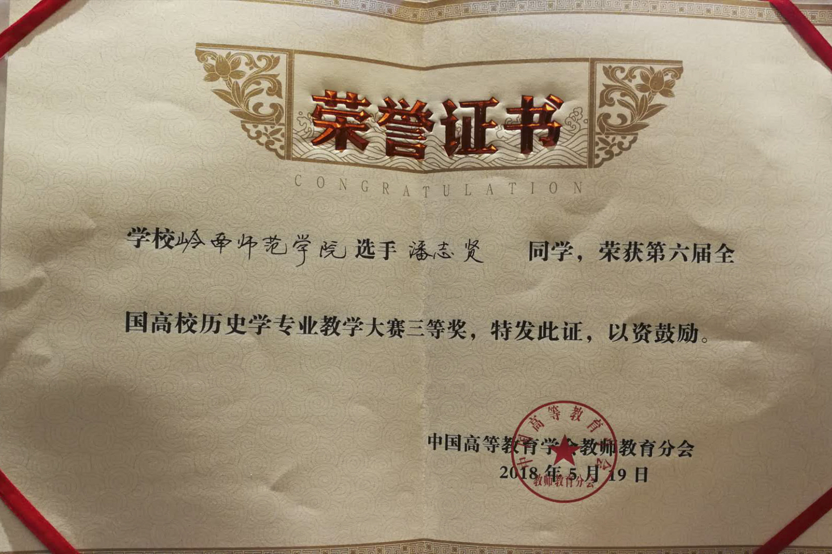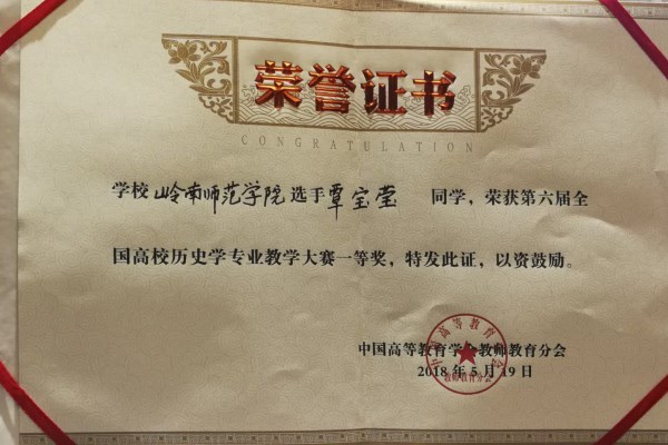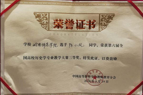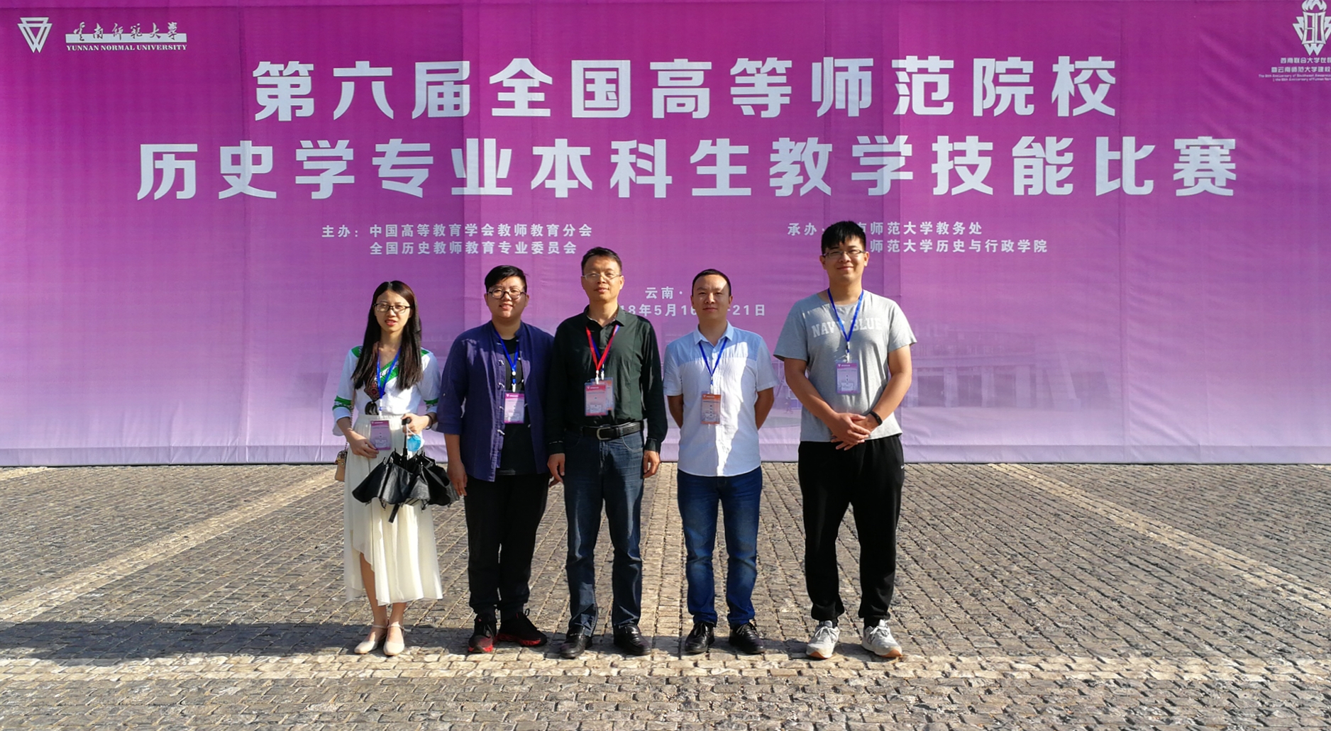 5月16日至21日,第六届全国高等师范院校历史学本科生教学技能比赛在云南师范大学举行,来自全国97所师范类院校的近三百名选手同台竞技,展开激烈竞争。我校选派2015级历史专业的覃宝莹、潘志贤、陈小凤等三名同学参赛,在比赛中,我校参赛选手表现出色,全部获奖,再创佳绩。其中,覃宝莹、潘志贤两位同学分获说课比赛一等奖和三等奖,陈小凤同学荣获讲课比赛三等奖,刷新去年参加该项赛的获奖记录。