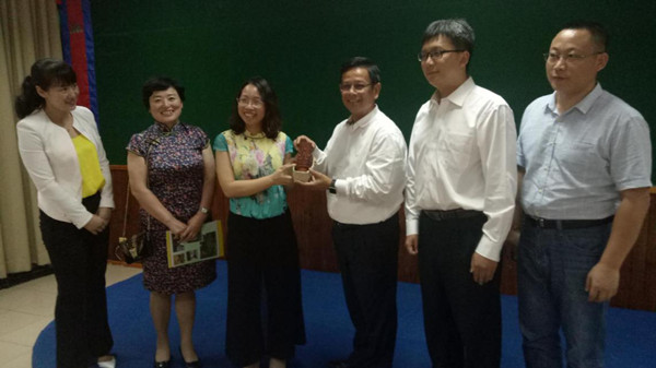 与柬埔寨国家技术培训学院校长互赠纪念品