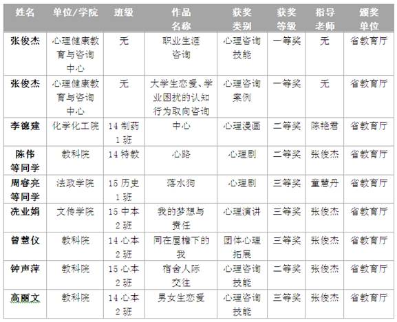 省教育厅在今年5月至9月,在全省高校开展了2017年度高校学生心理健康教育系列活动。我校党委学生工作部高度重视,加大经费投入,指导校心理健康教育与咨询中心具体组织,面向全校师生开展了校园心理剧大赛、原创心理漫画大赛、心理健康教育与咨询技能三大比赛(包括心理演讲比赛、拓展比赛及咨询技能比赛)和“助力成长”心理健康教育与咨询技能展示活动,精心组织了校内选拔赛,选拔优秀作品参加湛江区域赛。在省高校大学生心理健康教育与咨询湛江区域中心的区域选拔赛中,我校作品以优异的质量获得评委的认可,获推荐参加全省决赛。经过省教育厅组织专家评审,我校心理健康教育与咨询中心张俊杰老师荣获“心理咨询技能”一等奖和“心理咨询案例”一等奖;化学化工学院李德建同学的心理漫画作品《中心》获“大学生原创心理漫画”二等奖(指导老师:陈艳君);教科院陈伟等同学获“大学生原创心理剧”二等奖(指导老师:张俊杰)和法政学院周睿亮等同学获三等奖(指导老师:童慧丹);文传学院冼业娟同学获“心理健康主题演讲”三等奖(指导老师:张俊杰);教科院曾慧仪同学荣获“团体心理拓展技能”三等奖(指导老师:张俊杰);教科院钟声萍、高丽文同学分别荣获“心理咨询技能”二、三等奖(指导老师:张俊杰)。