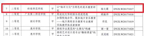 与此同时在广东省第五届高校艺术教育科研论文报告会中,我校蒋龙老师的《提高大学生音乐修养—电影音乐欣赏选修课应用研究》荣获一等奖,杨文霞老师的《以“海洋文化”为特色的美术教育研究》荣获二等奖,充分展现了我校师资能力的雄厚,建设校园课堂文化的前景之辉煌,体现了我校对学生素质培养的高度重视。