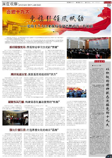 为了迎接党的十九大的胜利召开,支部书记关天冲撰写了《以积极的精神状态迎接党的十九大》的“燕岭时评”,并与支部党员郑定合作撰写了《喜迎十九大,党旗引领风帆劲——党的十八大以来我校党建思想政治工作掠影》的通讯报道。校园网上开设了“党的十九大精神”专栏,利用标语横幅、LED屏营造了良好的宣传氛围。
