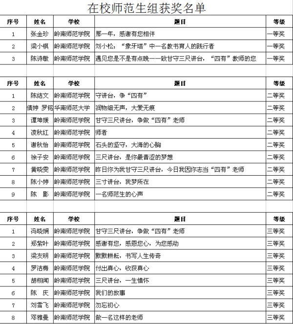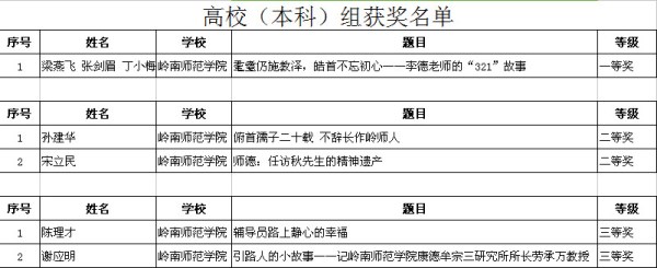 近日,从广东省教育厅传来喜讯,我校师生在第六届师德征文活动中取得优异成绩。经过专家初评、复评、评委会终评的激烈竞争,我校在本科高校教师组有5篇征文获奖,梁燕飞、张剑眉、丁小梅获得一等奖;孙建华、宋立民获得二等奖;陈理才、谢应明获得三等奖;获奖数在该组别中名列各高校前茅。在校师范生组有20篇获奖,占该组别全省获奖征文的35%,其中张金珍等3人获一等奖,陈结文等9人获二等奖,冯晓娴等8人获三等奖。