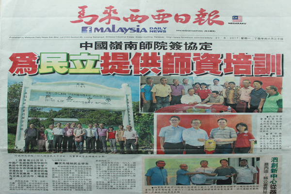 19日下午,调研团乘飞机前往沙捞越州诗巫市(Sibu),20日上午从诗巫乘车到泗里街(Sarikei)泗里奎民立中学调研及洽谈合作事宜。调研团受到了泗里奎民立中学黄华强董事长、吴翠美校长等领导、老师和学生的热烈欢迎。双方举行了简朴而又隆重的学术交流会。交流会上,黄华强董事长、吴翠美校长分别介绍了民立中学的华文教育创办历程与教学、科研情况,莫海文教授简要介绍了我校和南海丝绸之路协同创新中心的情况,其后与会人员就海外华文教育的新机遇与新问题展开热烈的讨论,提出自己的观点与建议。双方就人才培养与科研合作达成多项共识,签署了《岭南师范学院与马来西亚泗里奎民立中学合作协议》。根据协议,泗里奎民立中学将为我校科研人员赴马来西亚开展语言、文化及教育考察提供必要的帮助;我校将为民立中学提供师资培训,优先招收民立中学留学生。这是南海丝绸之路协同创新中心与国外单位签署的第一份合作协议,是协同创新中心海外基地建设的新突破。8月21日的《马来西亚日报》头版头条报道了该消息,这在沙捞越州华人群体中引起了很大的反响,在一定程度上提高了我校在海外的知名度。